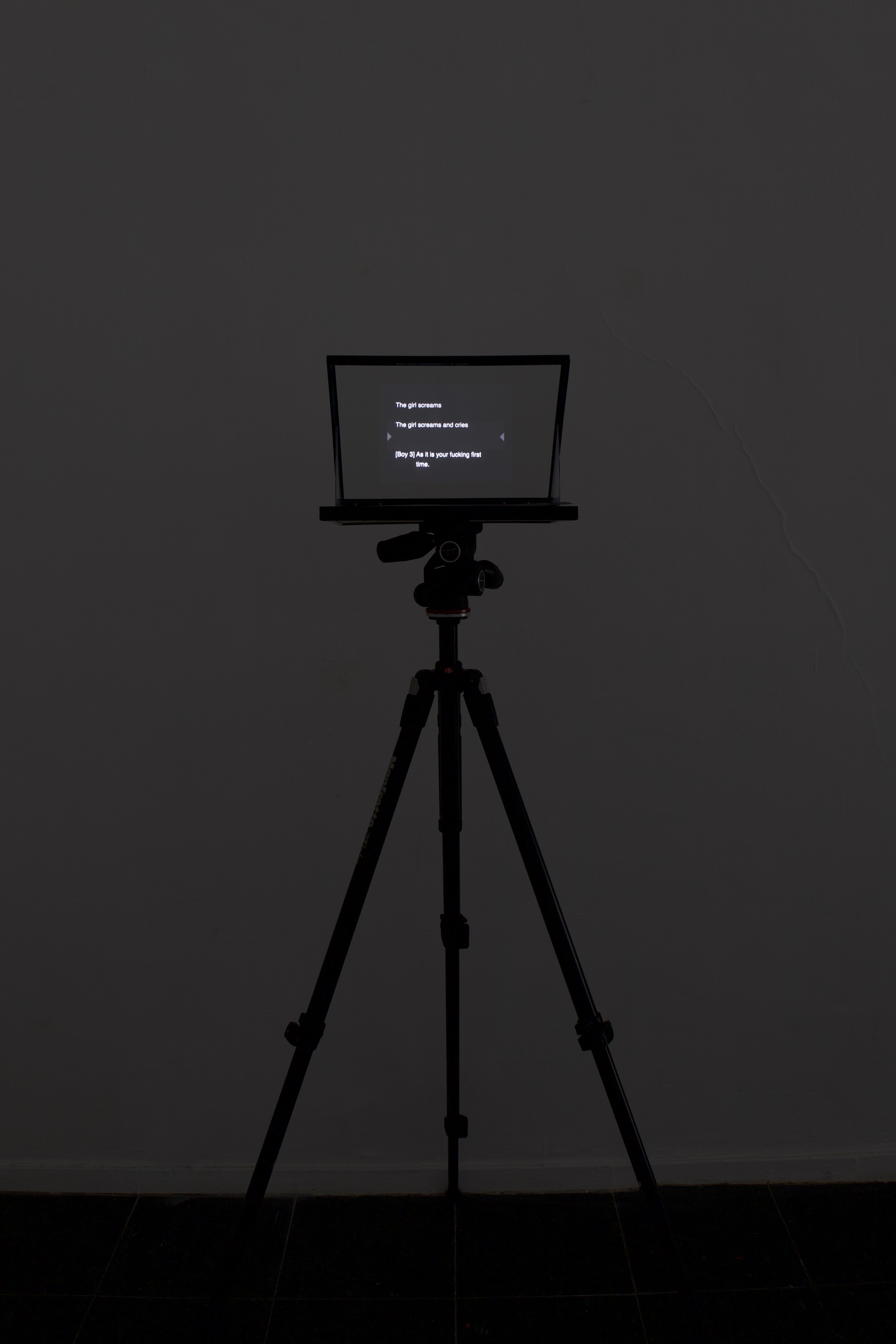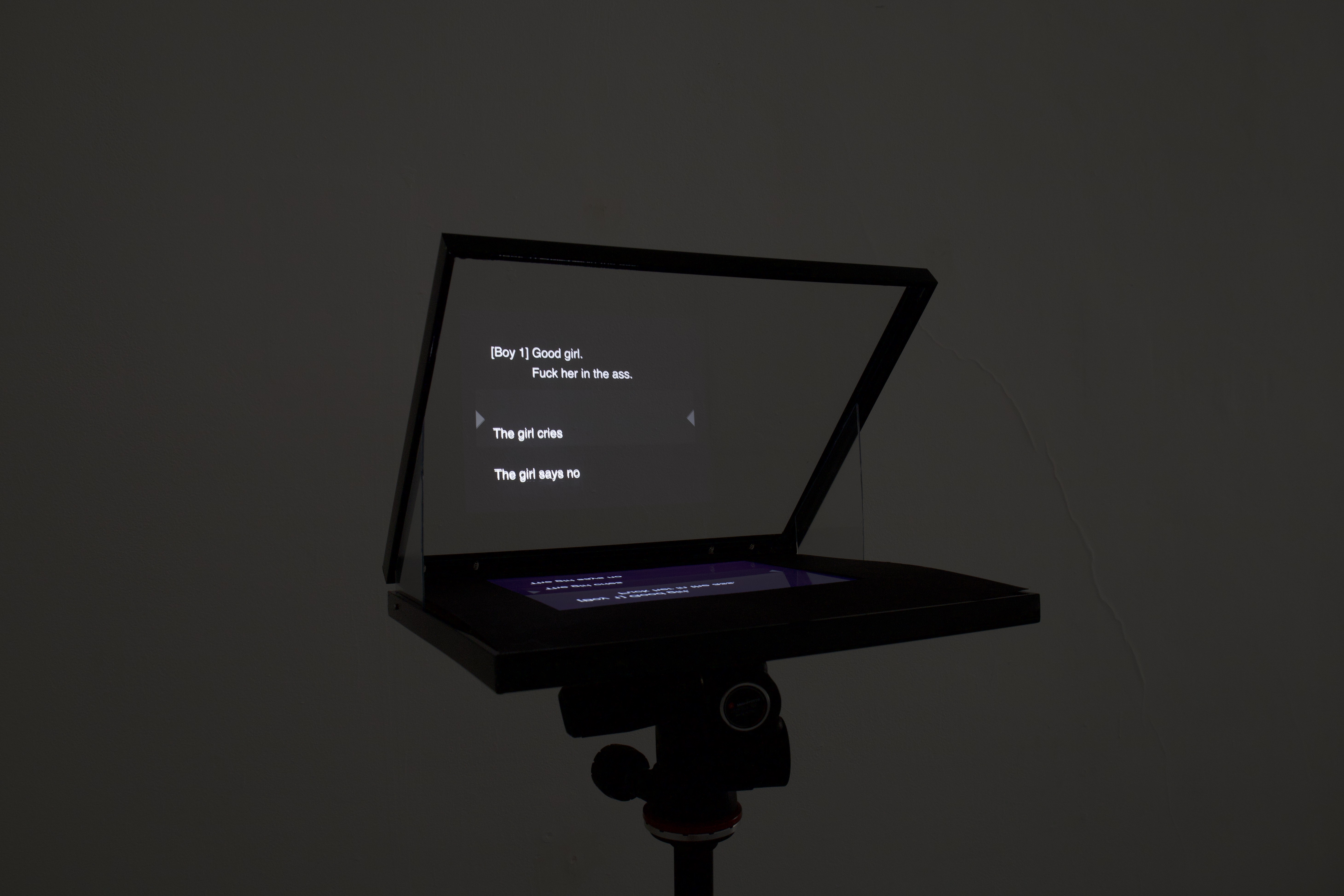 Une alcôve noire accueille l’installation: un film porno dépouillé de l’image et du son. Il ne reste que les dialogues restranscrits et les didascalies. Le script défile sur un prompteur. L’écran est noir. Les scènes de domination masculine et le «non» adressé par la femme éclairent les zones d’ombres. Ce dispositif «clinique», muet et aveugle, accentue la perception de la violence.