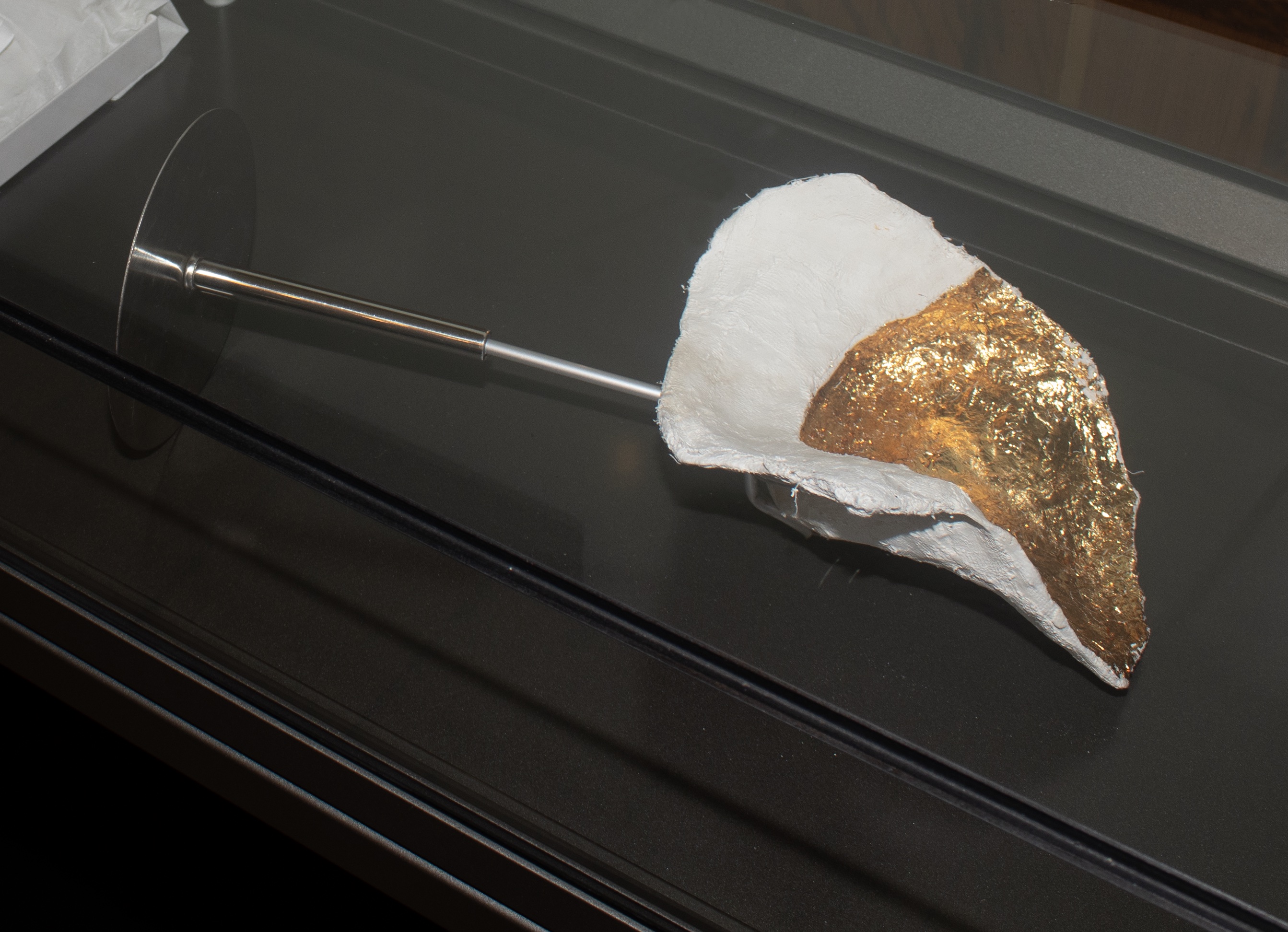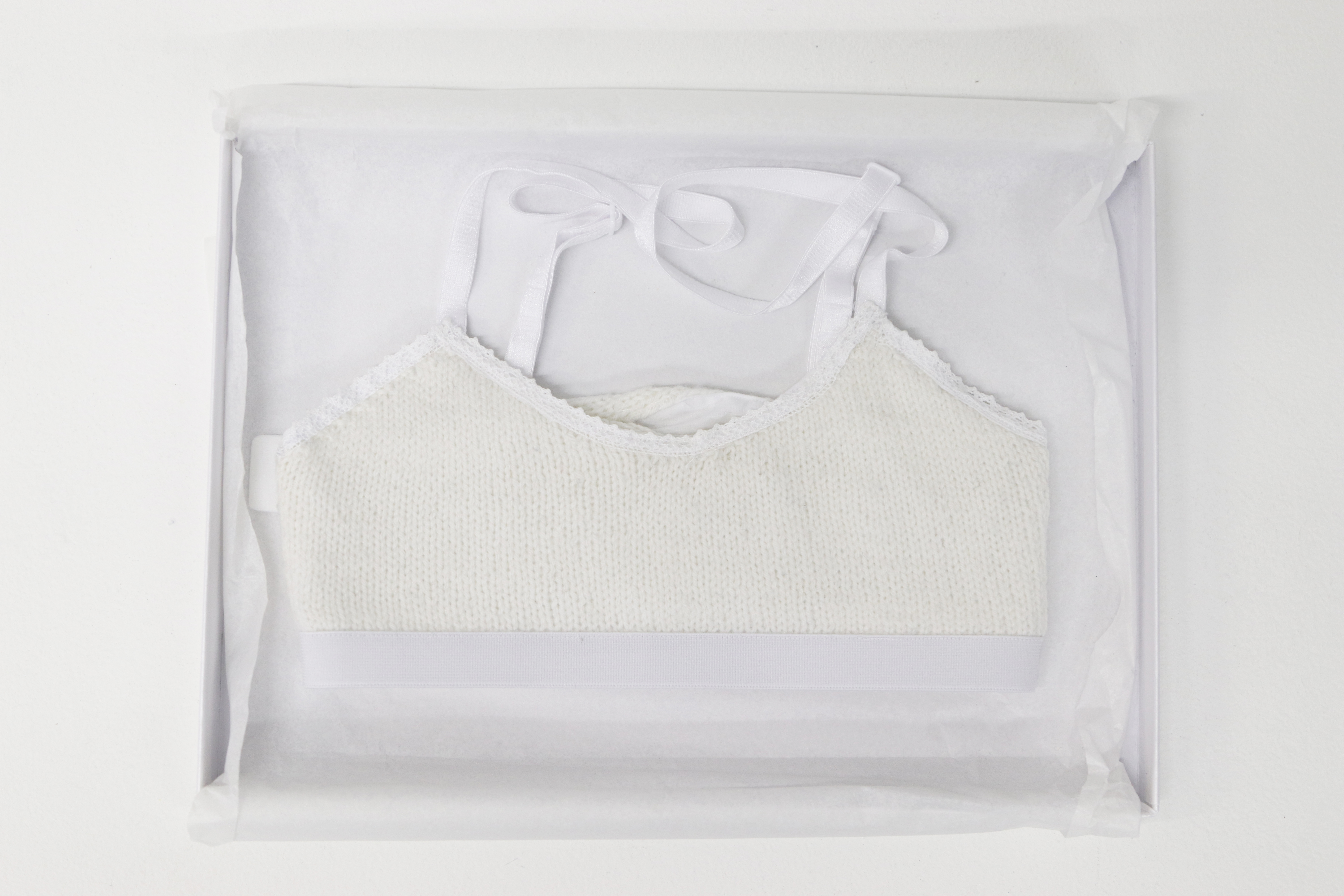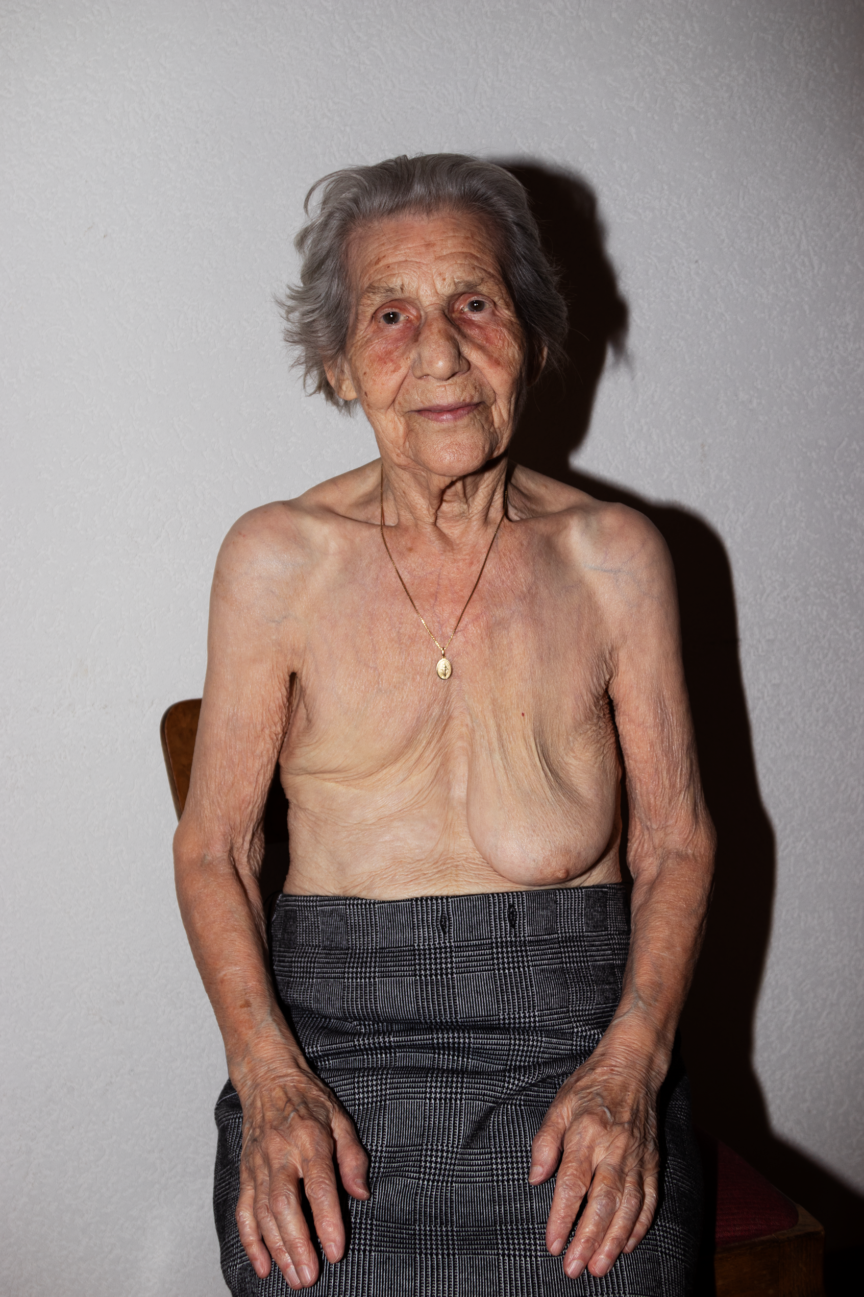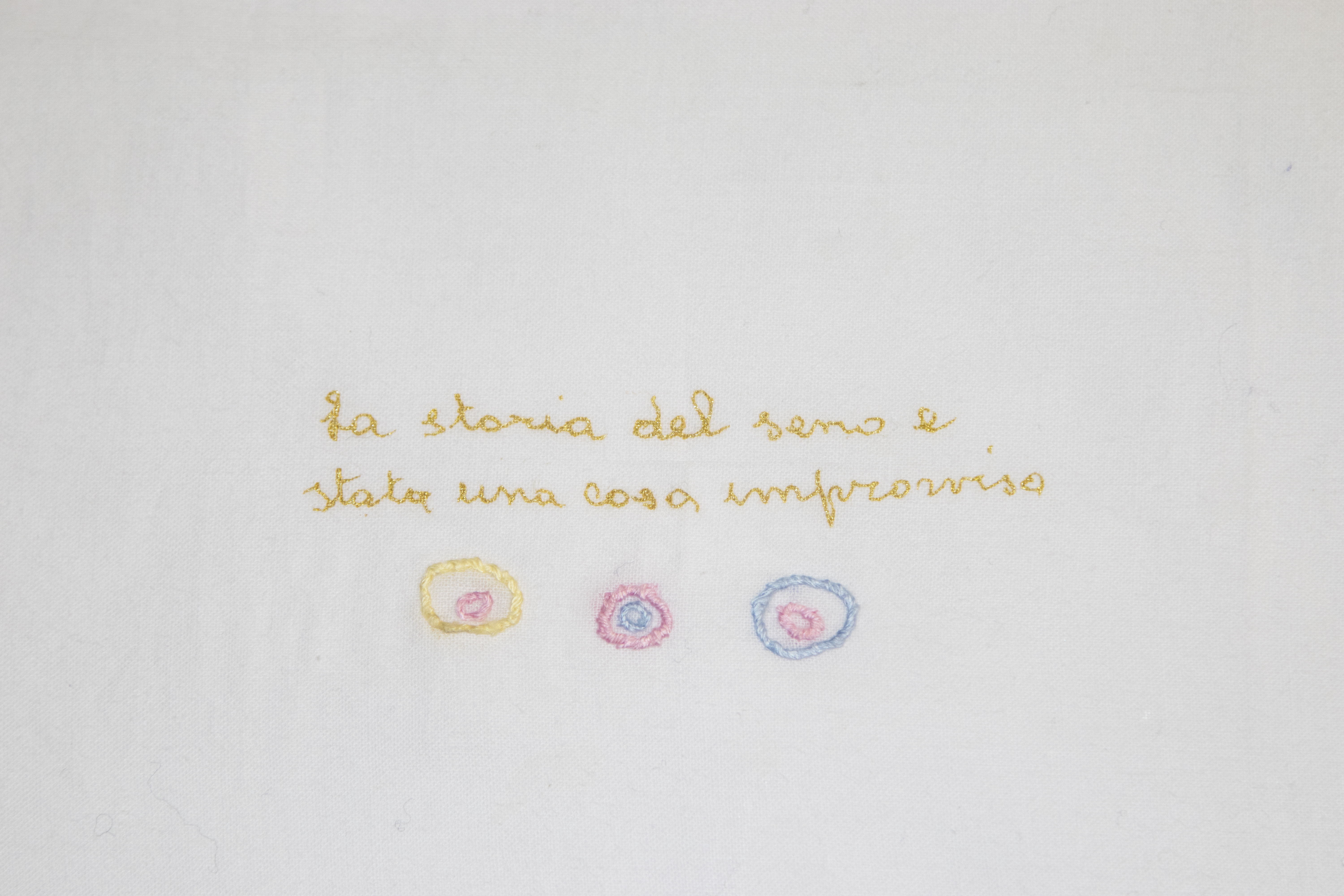 En 1990, à l’âge de 68 ans, ma nonna (grand-maman) est atteinte d’un cancer. Elle subit une ablation du sein droit. Depuis, elle porte une prothèse dans son soutien-gorge. Dans un geste intime et symbolique, je lui moule son sein restant, et dépose de la feuille d’or dans le moulage. En retour, elle tricote et coud un soutien-gorge en s’inspirant de l’un des siens. Cet échange prend une dimension particulière, touchant à nos rapports délicats avec nos poitrines respectives. Ce moment libère sa parole, renforce notre lien et notre confiance.